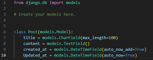 created_at: 작성한 글의 생성 날짜 | DataTimeFiled()를 사용, 날짜와 시간을 저장, auto_now_add를 통해 데이터 생성 시간 저장