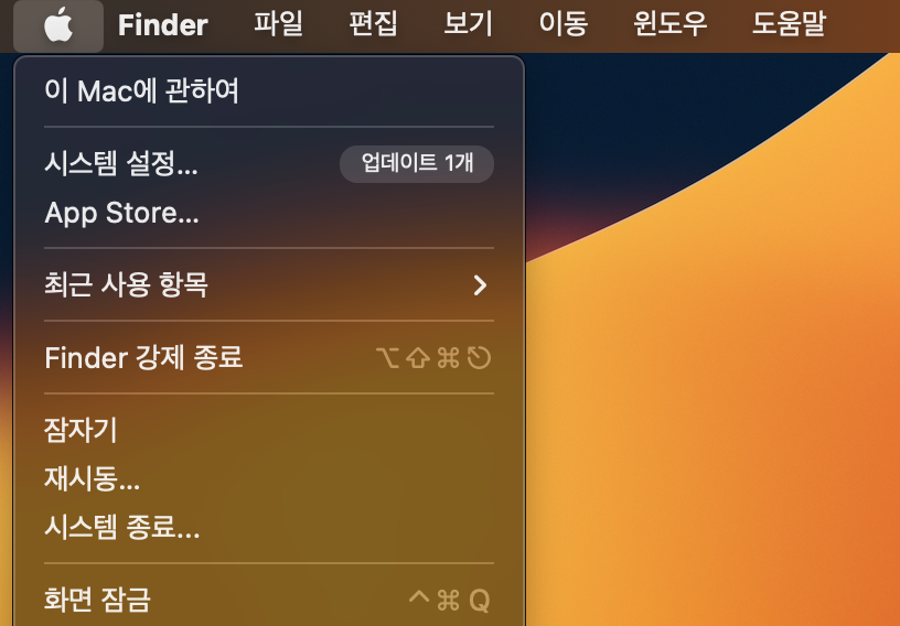 먼저 맥 사과 모양을 누르시면