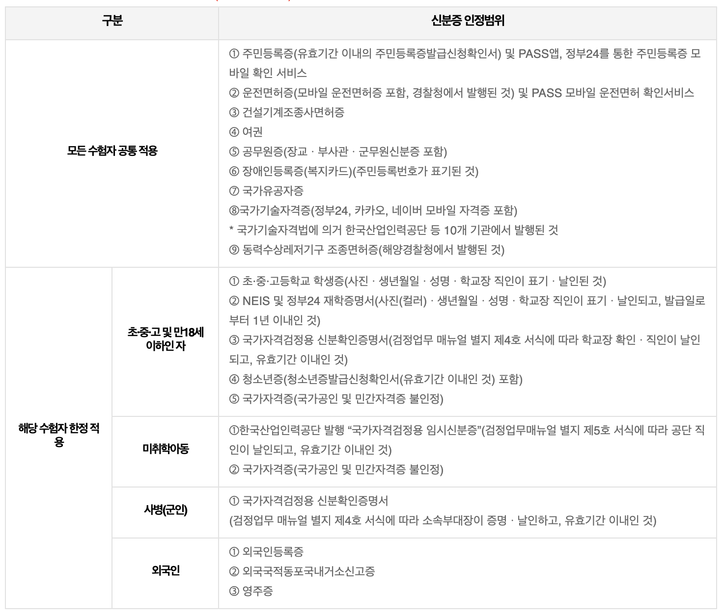 수험자 가이드 국가기술자격 수험자 가이드 ※ 아래 해당항목을 클릭하시면 자세한 내용을 보실수 있습니다. 인정 신분증 범위 국가기술자격검정(한국산업인력공단 시행)에 응시하는 수험자는